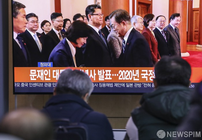 [서울=뉴스핌] 이한결 기자 = 7일 오전 서울 용산구 서울역 대합실에서 시민들이 문재인 대통령의 신년사 발표 생중계를 시청하고 있다. 2020.01.07 alwaysame@newspim.com