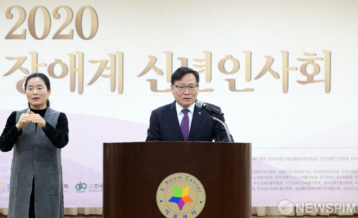 [서울=뉴스핌] 정일구 기자 = 김광환 한국장애인단체총연합회 상임대표가 7일 오전 서울 영등포구 이룸센터에서 열린 2020 장애계 신년인사회에서 신년사를 하고 있다. 2020.01.07 mironj19@newspim.com