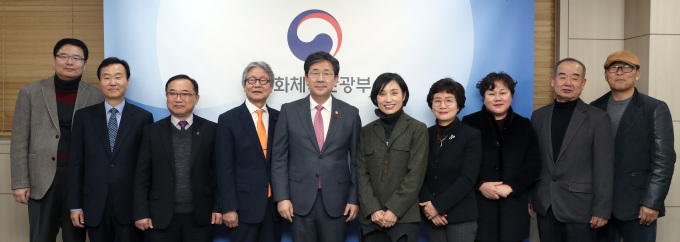 | [서울=뉴스핌] 이현경 기자 = 박양우 문화체육관광부 장관이 8일 서울 용산구 국립극단 회의실에서 열린 제6기 지역신문발전위원회 위원 위촉식에서 위원들과 기념촬영을 하고 있다. [사진=문체부] 2020.01.08 89hklee@newspim.com |