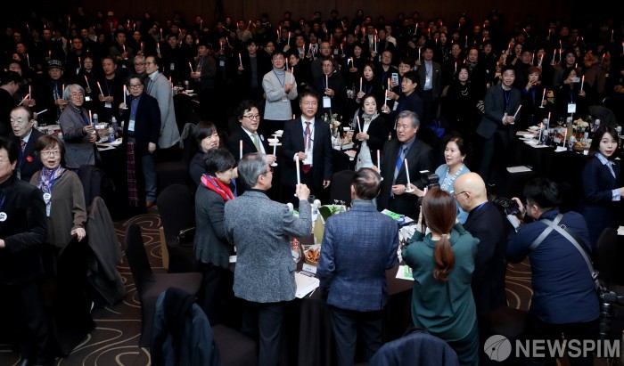 [성남=뉴스핌] 백인혁 기자 = 김용래 산업통상자원부 산업혁신성장실 실장, 윤주현 한국디자인진흥원 원장, 이길형 한국디자인단체총연합회 회장을 비롯한 참석자들이 9일 오후 경기 성남시 코리아디자인센터에서 열린 2020 디자인계 신년인사회에서 2020 디자인 세레머니를 하고 있다. 2020.01.09 dlsgur9757@newspim.com