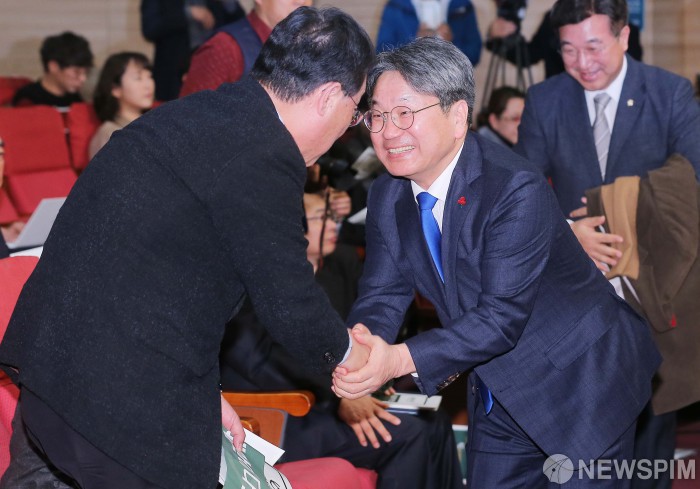 [서울=뉴스핌] 윤창빈 기자 = 강기정 청와대 정무수석이 12일 오후 서울 여의도 국회의원회관에서 열린 대안신당 창당대회에서 참석자들과 악수를 하고 있다. 2020.01.12 pangbin@newspim.com