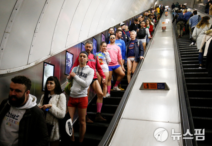 | [런던 로이터=뉴스핌] 박우진 기자 = 12일(현지시간) 영국 런던에서 열린 '노 트라우저 튜브 라이드(No Trousers Tube Ride)' 참가자들이 바지를 입지 않은 채 지하철 역 안에 에스컬레이터를 타고 있다. '노 트라우저 튜브 라이드'는 시민들이 바지나 치마를 입지 않고 지하철을 타는 행사다. 2020.01.12 krawjp@newspim.com |