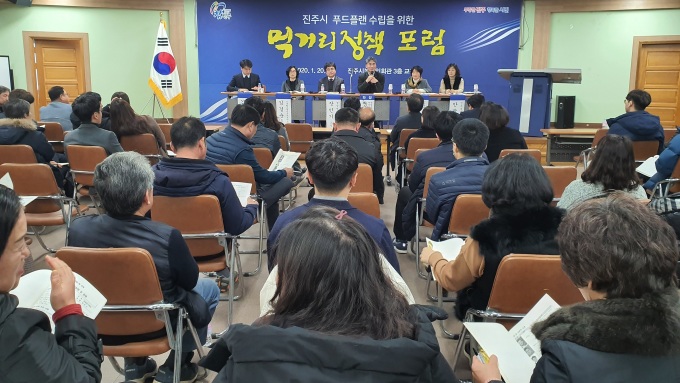 | 진주시는 20일 농업인회관 3층 교육장에서 푸드플랜 수립을 위한 먹거리정책 정책 포럼을 개최했다. [사진=진주시] 2020.01.20 |