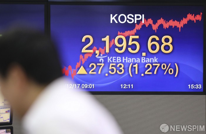 [서울=뉴스핌] 이한결 기자 = 외국민 매수세로 코스피가 1% 이상 급등한 17일 오후 서울 중구 KEB하나은행 딜링룸에서 딜러들이 업무를 보고 있다. 2019.12.17 alwaysame@newspim.com