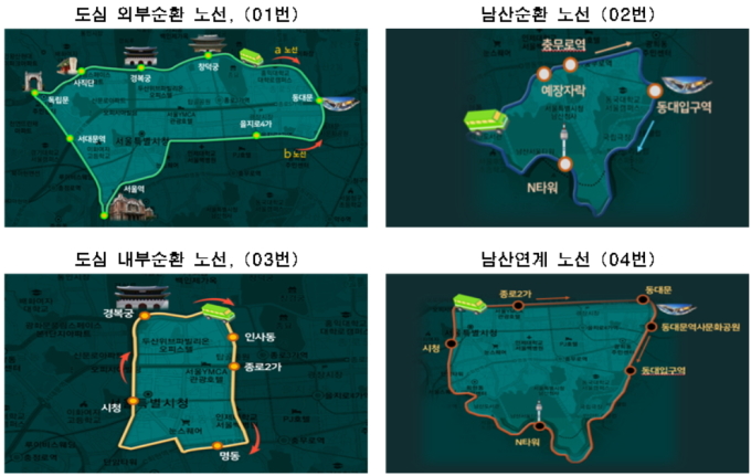 전체 4개 노선으로 도심외부순환(01번), 남산순환(02번), 도심내부순환(03번), 남산연계(04번)이다. 주요 관광지인 명동, 남산타워, 서울역부터 동대문, 인사동, 경복궁, 사직공원, 독립문을 도는 코스로 각 노선이 운행된다.