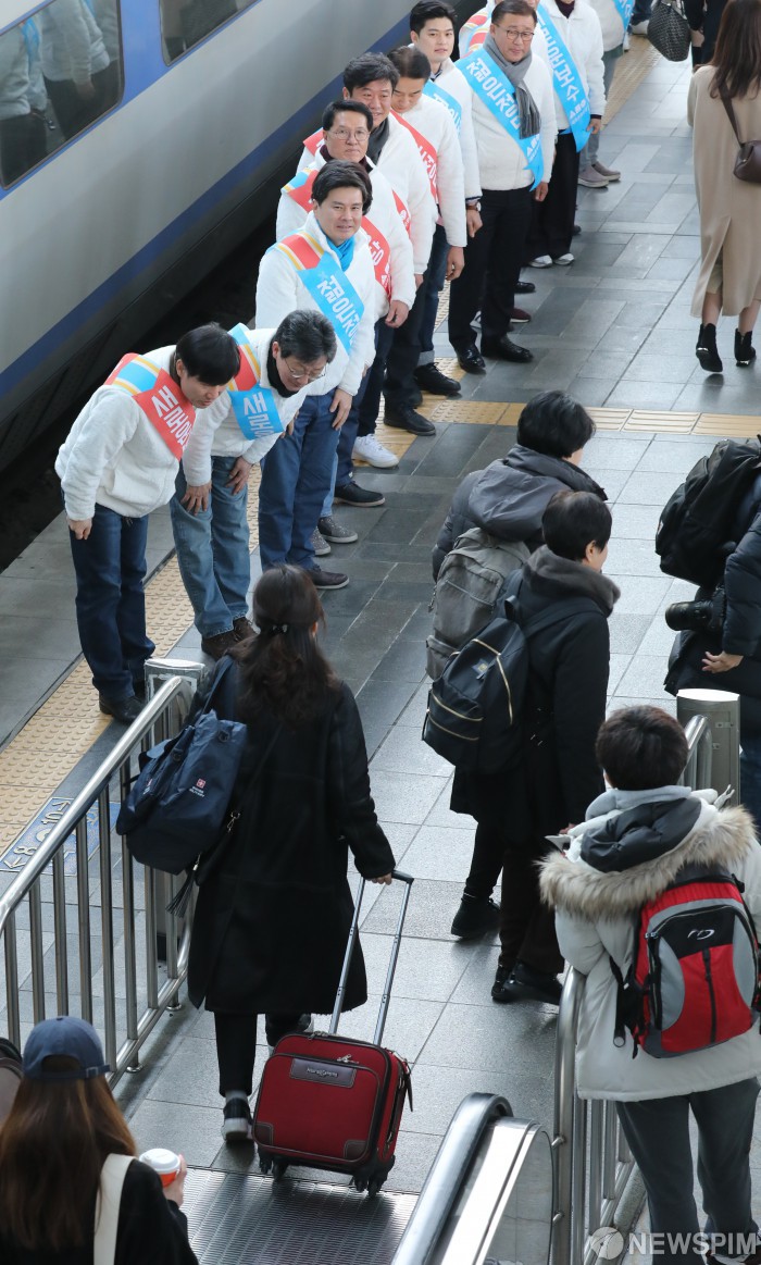 [서울=뉴스핌] 백인혁 기자 = 유승민 새로운보수당 의원을 비롯한 의원들이 23일 오전 서울 용산구 서울역 플랫폼에서 시민들에게 설 귀향인사를 하고 있다. 2020.01.23 dlsgur9757@newspim.com