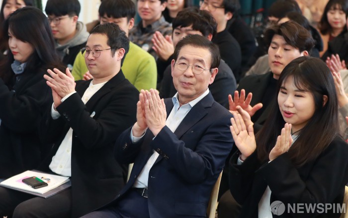 [서울=뉴스핌] 이형석 기자 = 박원순 서울시장이 29일 오후 서울 중구 로컬스티지 소공점에서 열린 2019 청정경북 성과공유회에서 박수를 치고 있다. 2020.01.29 leehs@newspim.com