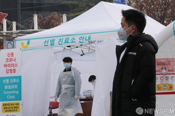 [서울=뉴스핌] 백인혁 기자 = 국내 신종 코로나바이러스 감염증 12번째 확진 환자가 발생한 1일 오후 서울 중구 명동역 6번출구 앞에 신종 코로나바이러스 감염증의 유입과 확산을 방지하기 위해 설치된 중구 보건소 선별상담소와 선별진료소 앞을 외국인 관광객이 지나고 있다. 2020.02.01 dlsgur9757@newspim.com