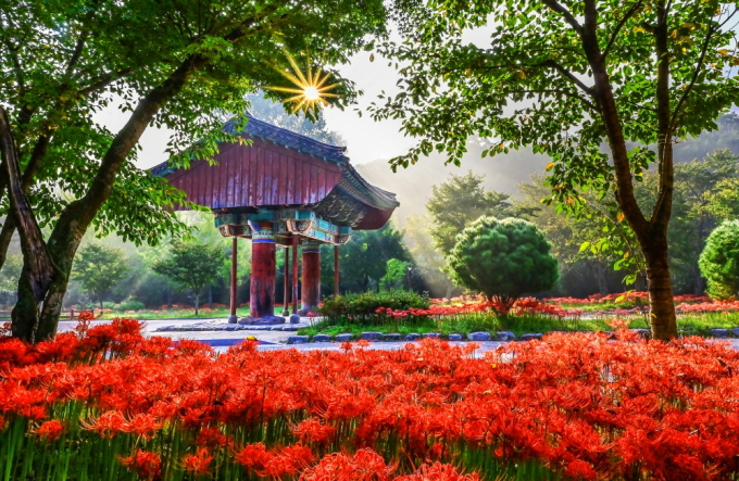 '선운사의 아침'은 새빨간 꽃무릇이 활짝 핀 선운사 길목의 아침풍경을 담아낸 수작이다.