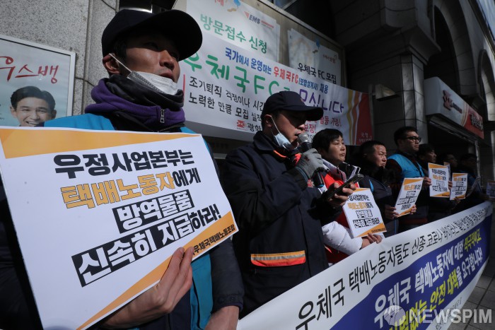 [서울=뉴스핌] 백인혁 기자 = 전국우체국택배노동조합원들이 6일 오후 서울 종로구 광화문 우체국 앞에서 우체국 택배노동자에 대한 적극적이고 차별없는 안전 대책 요구 기자회견을 열고 발언하고 있다. 2020.02.06 dlsgur9757@newspim.com