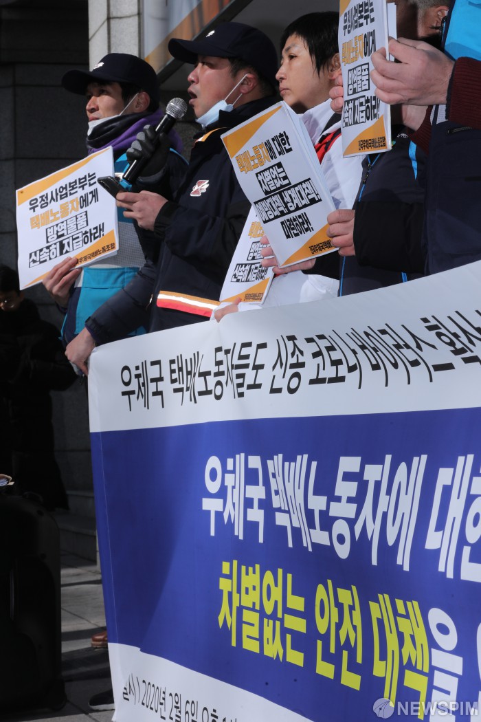 [서울=뉴스핌] 백인혁 기자 = 전국우체국택배노동조합원들이 6일 오후 서울 종로구 광화문 우체국 앞에서 우체국 택배노동자에 대한 적극적이고 차별없는 안전 대책 요구 기자회견을 열고 발언하고 있다. 2020.02.06 dlsgur9757@newspim.com