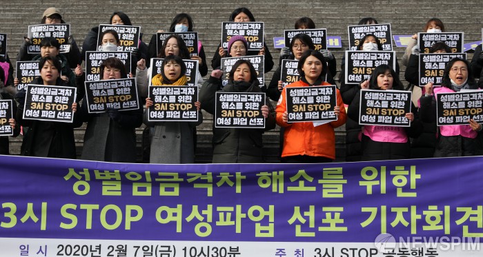 [서울=뉴스핌] 최상수 기자 = 3시 스탑 공동행동이 7일 오전 서울 종로구 세종문화회관 앞에서 열린 제 4회 3시 STOP 여성파업 선포 기자회견에서 구호를 외치고 있다. 2020.02.07 kilroy023@newspim.com