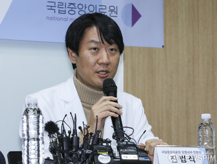 [서울=뉴스핌] 이한결 기자 = 진범식 국립중앙의료원 감염내과 전문의(2, 13, 23, 24번 환자 주치의)가 7일 오후 서울 중구 국립중앙의료원에서 열린 ‘신종 코로나바이러스 감염증 중앙임상TF 브리핑’에서 발언을 하고 있다. 이날 브리핑에서는 확진환자 확대에 따른 치료 임상 현황 개관과 한국 신종 코로나 감염증의 임상적 특성 등을 발표했다. 2020.02.07 alwaysame@newspim.com