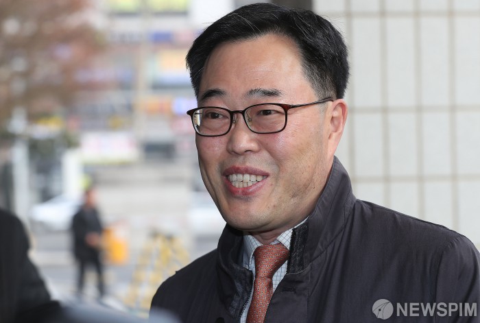 [서울=뉴스핌] 정일구 기자 = '정치자금법 위반' 혐의를 받는 김기식 전 금융감독원장이 13일 오전 서울 양천구 서울남부지방법원에서 열린 1심 선고 공판에 출석하고 있다. 2020.02.13 mironj19@newspim.com