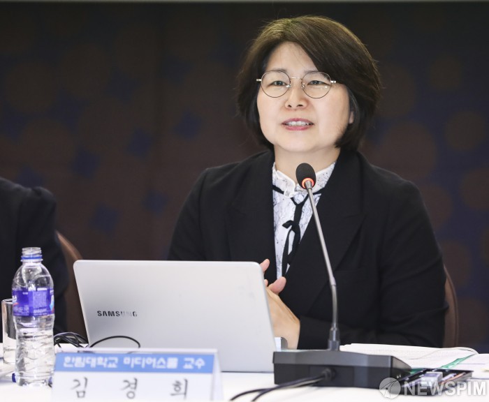 [서울=뉴스핌] 이한결 기자 = 김경희 한림대학교 미디어스쿨 교수가 13일 오후 서울 중구 한국프레스센터에서 열린 긴급토론회 ‘감염질병과 언론보도’에서 코로나19(신종 코로나바이러스 감염증) 보도에 대해 발제하고 있다. 2020.02.13 alwaysame@newspim.com