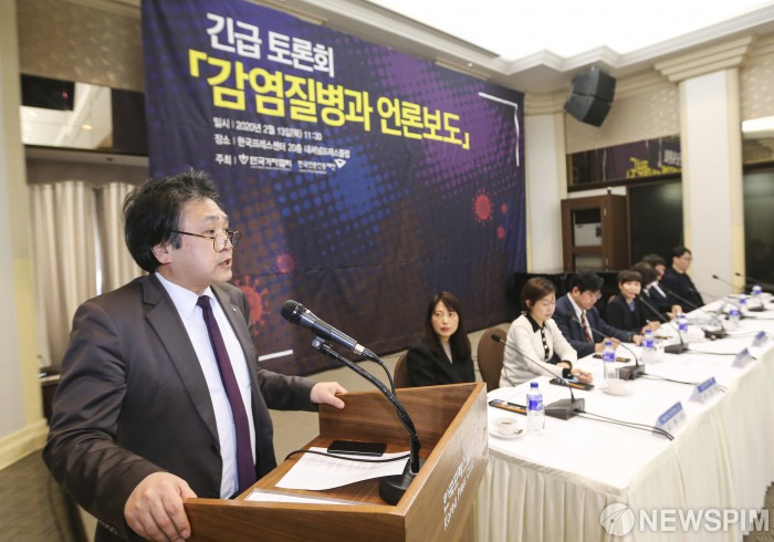 [서울=뉴스핌] 이한결 기자 = 김철훈 한국언론진흥재단 미디어본부장이 13일 오후 서울 중구 한국프레스센터에서 열린 긴급토론회 ‘감염질병과 언론보도’에서 코로나19(신종 코로나바이러스 감염증) 보도와 관련해 인사말을 하고 있다. 2020.02.13 alwaysame@newspim.com