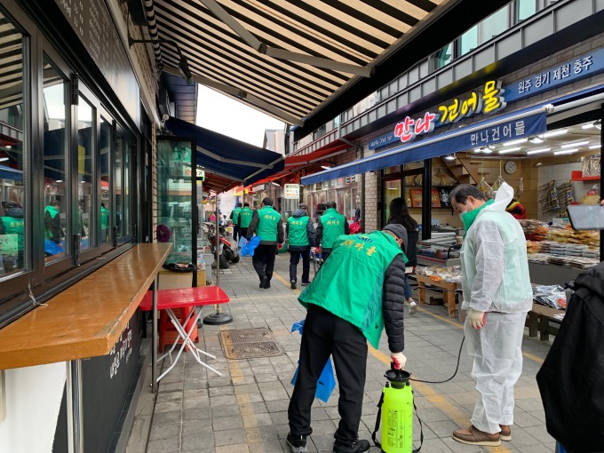| [강릉=뉴스핌] 이순철 기자 = 강원 강릉시 주문진읍 자생단체들이 최근 코로나19로 침체된 지역경제 활성화를 위해 시장 일대 방역 및 환경정화 활동을 실시했다.[사진=강릉시]2020.02.13 grsoon815@newspim.com |