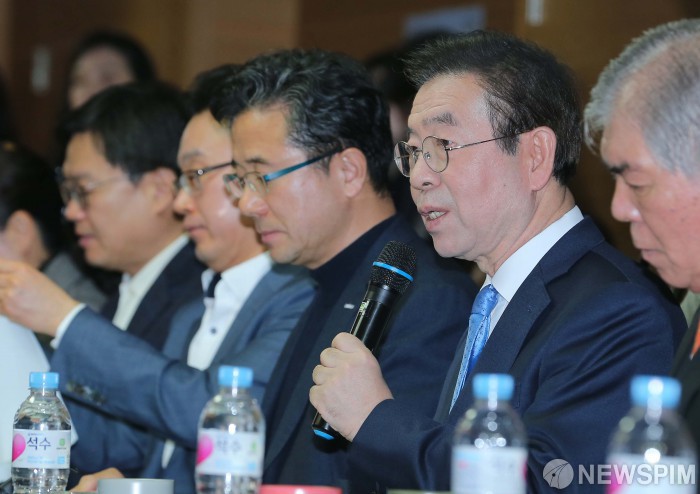 [서울=뉴스핌] 윤창빈 기자 = 박원순 서울특별시 시장이 14일 오전 서울 중구 써미트호텔에서 열린 ‘코로나19 극복을 위한 관광업계 간담회’에서 인사말을 하고 있다. 2020.02.14 pangbin@newspim.com