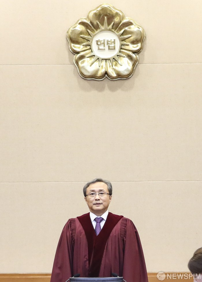 [서울=뉴스핌] 이한결 기자 = 유남석 헌법재판소장이 14일 오후 서울 종로구 헌법재판소 대심판정에서 열린 ‘국회의원과 국회의장 등 간의 권한쟁의’ 심판사건에 대한 공개변론에 참석하고 있다. 자유한국당 의원들(장제원, 나경원 등)이 사보임 과정과 형사소송법 개정안 및 공수처법 처리과정 등을 문제 삼아 문희상 국회의장 등을 상대로 낸 권한쟁의 심판사건 및 공개변론이다. 한편 이날 오후 4시에는 ‘국회의원과 국회 정치개혁특별위원회(정개특위) 안건조정위원장 등 간의 권한쟁의’ 심판사건에 대한 공개변론도 진행된다. 2020.02.14 alwaysame@newspim.com