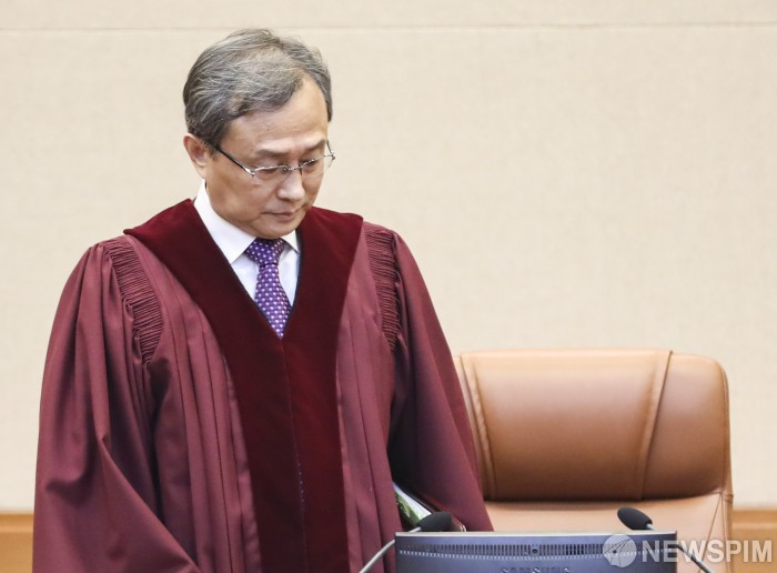 [서울=뉴스핌] 이한결 기자 = 유남석 헌법재판소장이 14일 오후 서울 종로구 헌법재판소 대심판정에서 열린 ‘국회의원과 국회의장 등 간의 권한쟁의’ 심판사건에 대한 공개변론에 참석하고 있다. 자유한국당 의원들(장제원, 나경원 등)이 사보임 과정과 형사소송법 개정안 및 공수처법 처리과정 등을 문제 삼아 문희상 국회의장 등을 상대로 낸 권한쟁의 심판사건 및 공개변론이다. 한편 이날 오후 4시에는 ‘국회의원과 국회 정치개혁특별위원회(정개특위) 안건조정위원장 등 간의 권한쟁의’ 심판사건에 대한 공개변론도 진행된다. 2020.02.14 alwaysame@newspim.com