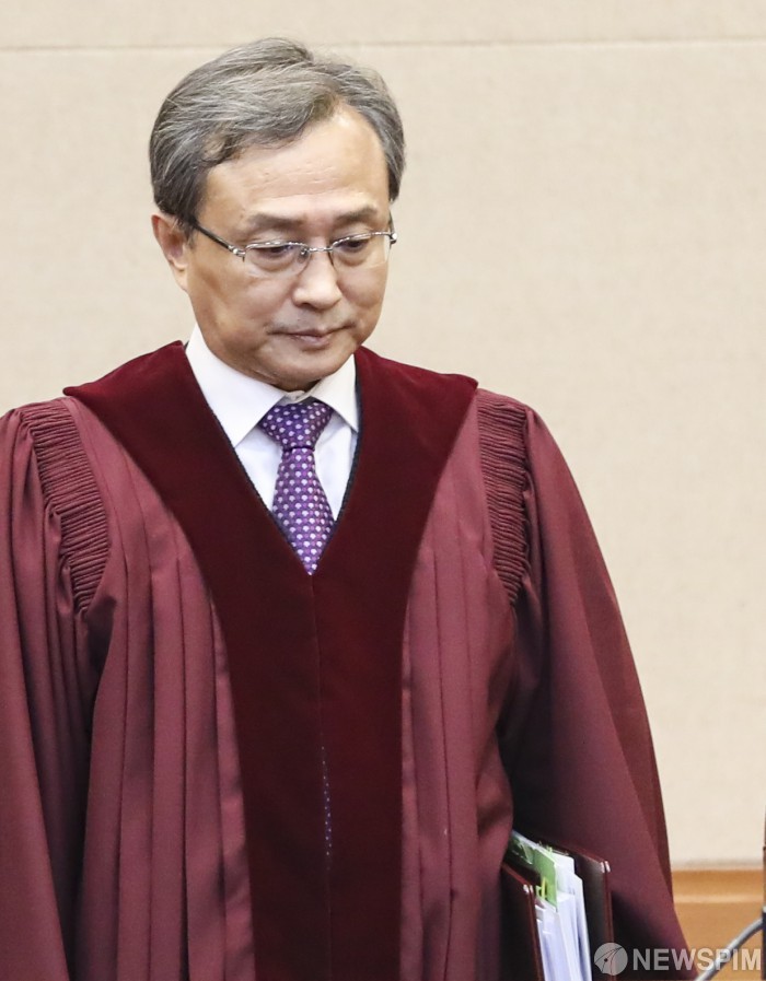 [서울=뉴스핌] 이한결 기자 = 유남석 헌법재판소장이 14일 오후 서울 종로구 헌법재판소 대심판정에서 열린 ‘국회의원과 국회의장 등 간의 권한쟁의’ 심판사건에 대한 공개변론에 참석하고 있다. 자유한국당 의원들(장제원, 나경원 등)이 사보임 과정과 형사소송법 개정안 및 공수처법 처리과정 등을 문제 삼아 문희상 국회의장 등을 상대로 낸 권한쟁의 심판사건 및 공개변론이다. 한편 이날 오후 4시에는 ‘국회의원과 국회 정치개혁특별위원회(정개특위) 안건조정위원장 등 간의 권한쟁의’ 심판사건에 대한 공개변론도 진행된다. 2020.02.14 alwaysame@newspim.com