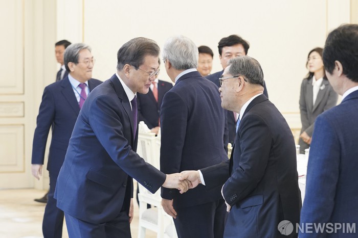 [서울=뉴스핌] 문재인 대통령이 19일 청와대에서 열린 코로나19 대책 논의를 위한 시·도교육감 초청 간담회에서 이재정 경기도 교육감과 인사를 하고 있다.[사진=청와대 ] 2020.02.19 photo@newspim.com