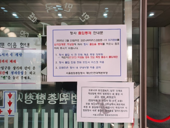 | [서울=뉴스핌] 장현석 기자 = 서울중앙지법과 서울고등법원은 24일 신종 코로나바이러스 감염증(코로나19)의 지역사회 확산으로 위기 경보가 '심각' 단계로 격상되면서 법정 감염병 발생에 대한 최고 수준의 대응 조치를 시행했다. 2020.02.24 kintakunte87@newspim.com |