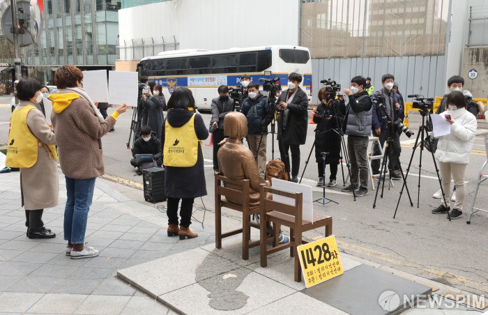 [서울=뉴스핌] 백인혁 기자 = 신종 코로나바이러스(코로나19)의 확산 방지를 위해 26일 오후 서울 종로구 옛 주한 일본대사관 앞 평화로에서 '제1428차 일본군성노예제 문제해결을 위한 정기 수요시위'가 온라인 집회로 열리고 있다. 정의기억연대는 코로나19의 확산 방지를 위해 28년만에 처음으로 온라인 집회를 진행했다. 2020.02.26 dlsgur9757@newspim.com