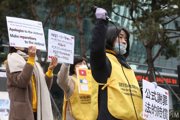 [서울=뉴스핌] 백인혁 기자 = 신종 코로나바이러스(코로나19)의 확산 방지를 위해 26일 오후 서울 종로구 옛 주한 일본대사관 앞 평화로에서 ‘제1428차 일본군성노예제 문제해결을 위한 정기 수요시위’가 온라인 집회로 열리고 있다. 정의기억연대는 코로나19의 확산 방지를 위해 28년만에 처음으로 온라인 집회를 진행했다. 2020.02.26 dlsgur9757@newspim.com