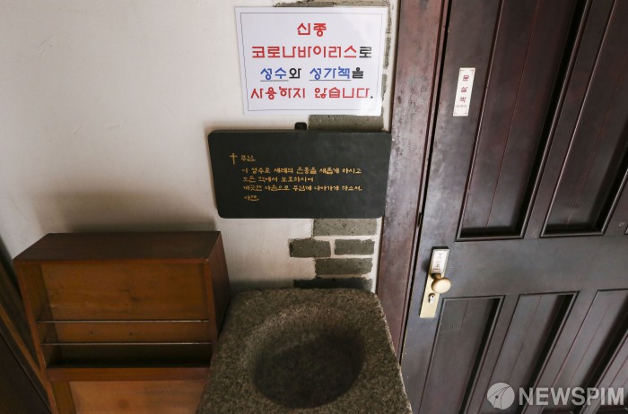 [서울=뉴스핌] 이한결 기자 = 26일 오후 서울 천주교 명동성당에 코로나19 확산 방지를 위한 성수 및 성가책 사용 중지 안내문이 붙어있다. 천주교 서울대교구장인 염수정 추기경은 25일 담화문을 통해 26일부터 3월 10일까지 14일간 미사를 중지하고 본당 내 회합이나 행사 등도 중단해달라고 밝혔다. 명동성당을 포함한 천주교 서울대교구가 미사를 중단한 것은 전신인 조선대목구가 지난 1931년 설정된 이후로 처음이다. 2020.02.26 alwaysame@newspim.com