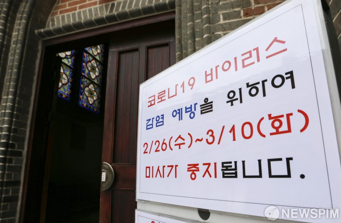 [서울=뉴스핌] 이한결 기자 = 26일 오후 서울 천주교 명동성당에 코로나19 확산 방지를 위한 미사 중지 안내문이 붙어있다. 천주교 서울대교구장인 염수정 추기경은 25일 담화문을 통해 26일부터 3월 10일까지 14일간 미사를 중지하고 본당 내 회합이나 행사 등도 중단해달라고 밝혔다. 명동성당을 포함한 천주교 서울대교구가 미사를 중단한 것은 전신인 조선대목구가 지난 1931년 설정된 이후로 처음이다. 2020.02.26 alwaysame@newspim.com