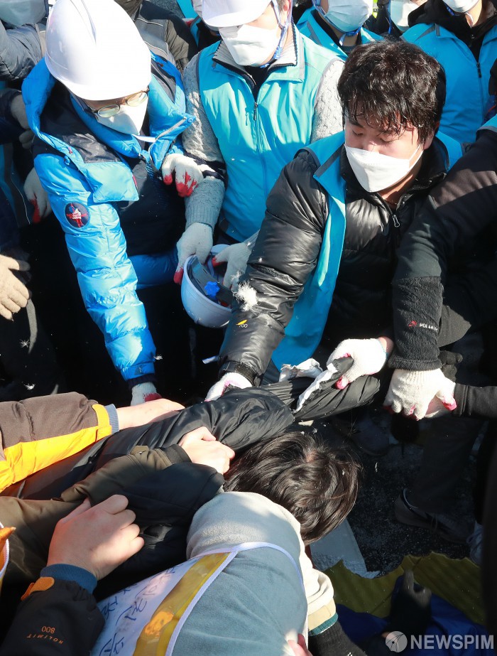 [서울=뉴스핌] 이형석 기자 = 27일 오전 서울 종로구 광화문광장에 마련된 고(故) 문중원 기수의 농성 천막이 행정대집행으로 철거되고 있다. 이날 서울시와 종로구는 문재인하야범국민투쟁본부, 고(故) 문중원 기수 시민대책위원회 등 단체가 설치한 천막을 코로나 19 확산을 차단하기 위해 철거했다. 2020.02.27 leehs@newspim.com