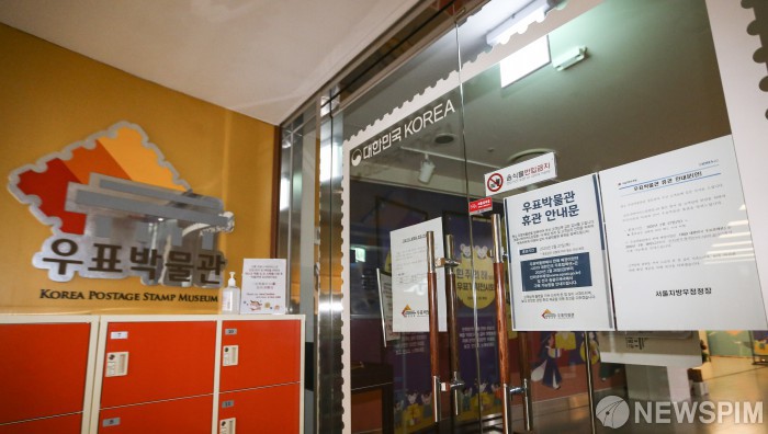 [서울=뉴스핌] 이한결 기자 = 27일 오전 서울 중구 서울중앙우체국에 위치한 우표박물관에 휴관 안내문이 붙어있다. 우표박물관은 코로나19(코로나바이러스감염증-19) 확산 방지를 위해 27일부터 임시 휴관하고 전시 관람 및 박물관 내 우표 상품판매 등을 당분간 중지한다고 밝혔다. 이에 따라 판매예정이었던 ‘2019 대한민국 우표컬렉션’은 오는 28일부터 인터넷우체국 사이트 및 전국 총괄 우체국에서 구매할 수 있다. 2020.02.27 alwaysame@newspim.com