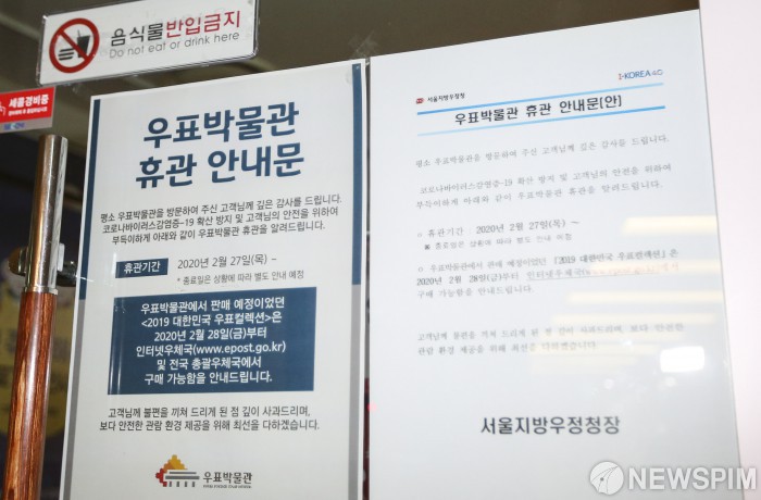 [서울=뉴스핌] 이한결 기자 = 27일 오전 서울 중구 서울중앙우체국에 위치한 우표박물관에 휴관 안내문이 붙어있다. 우표박물관은 코로나19(코로나바이러스감염증-19) 확산 방지를 위해 27일부터 임시 휴관하고 전시 관람 및 박물관 내 우표 상품판매 등을 당분간 중지한다고 밝혔다. 이에 따라 판매예정이었던 ‘2019 대한민국 우표컬렉션’은 오는 28일부터 인터넷우체국 사이트 및 전국 총괄 우체국에서 구매할 수 있다. 2020.02.27 alwaysame@newspim.com