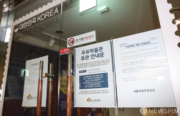 [서울=뉴스핌] 이한결 기자 = 27일 오전 서울 중구 서울중앙우체국에 위치한 우표박물관에 휴관 안내문이 붙어있다. 우표박물관은 코로나19(코로나바이러스감염증-19) 확산 방지를 위해 27일부터 임시 휴관하고 전시 관람 및 박물관 내 우표 상품판매 등을 당분간 중지한다고 밝혔다. 이에 따라 판매예정이었던 ‘2019 대한민국 우표컬렉션’은 오는 28일부터 인터넷우체국 사이트 및 전국 총괄 우체국에서 구매할 수 있다. 2020.02.27 alwaysame@newspim.com