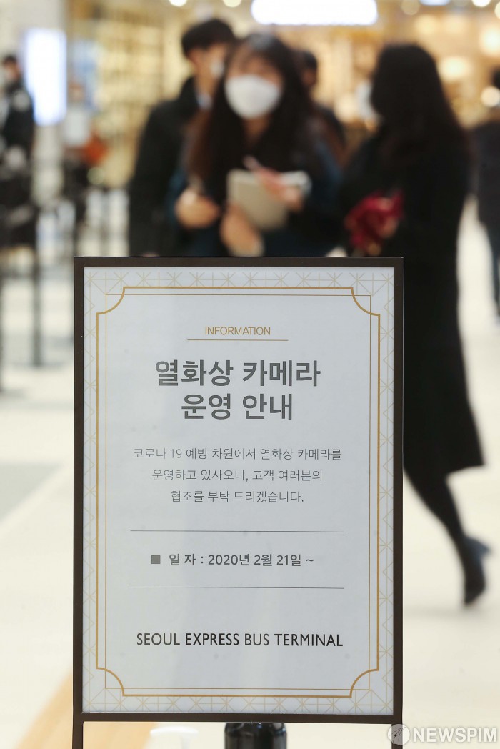 [서울=뉴스핌] 윤창빈 기자 = 코로나19 확진환자가 1500여명을 넘어가고 있는 가운데 27일 오후 서울 서초구 서울고속버스터미널 승차장에 열감지 카메라 운영 안내 문구가 세워져 있다. 2020.02.27 pangbin@newspim.com