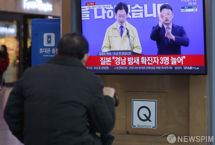 [서울=뉴스핌] 윤창빈 기자 = 코로나19 확진환자가 밤사이 256명이 추가되면서 오늘 오전 9시기준 확진환자가 총 2022명인 가운데 28일 오전 서울 중구 서울역의 시민들이 코로나19관련 뉴스를 시청하고 있다. 2020.02.28 pangbin@newspim.com