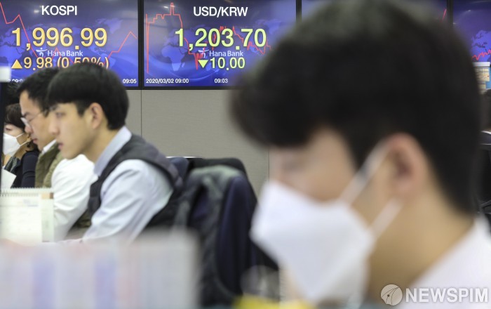 [서울=뉴스핌] 이한결 기자 = 코로나19(코로나바이러스감염증-19)의 확산세가 계속되고 있는 2일 오전 서울 중구 하나은행 딜링룸에서 딜러들이 업무를 보고 있다. 코스피 지수는 전 거래일 대비 10.02포인트(0.50%) 오른 1,997.03에 개장했고 달러/원 환율은 8.7원 내린 1,205.0원에 출발했다. 2020.03.02 alwaysame@newspim.com