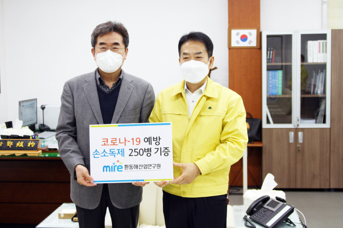 [울진=뉴스핌] 남효선 기자 = 경북 울진의 환동해산업연구원이 손소독제를 직접 제작, 울진군에 기증해 화제다.