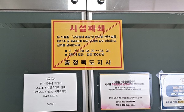 [청주=뉴스핌] 박상연 기자 = 충북도가 도내 신천지 관련 시설에 대한 행정명령을 내림에 따라 일선 시·군이 관련시설 폐쇄 및 통제에 나서고 있다.