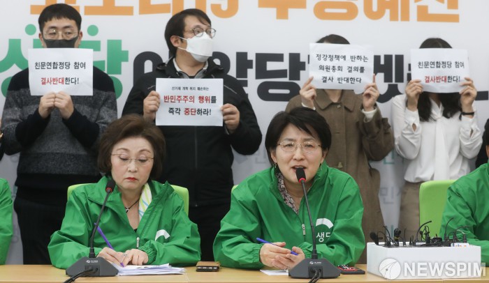 [서울=뉴스핌] 최상수 기자 = 박주현 민생당 공동대표(앞 줄 오른쪽)가 18일 오전 서울 여의도 국회에서 열린 긴급 최고위원회의에서 모두발언을 하고 있다. 2020.03.18 kilroy023@newspim.com