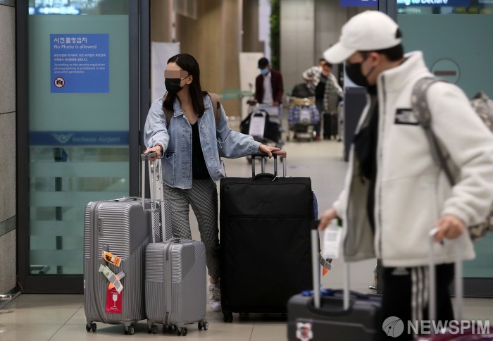 [영종도=뉴스핌] 정일구 기자 = 신종 코로나바이러스 감염증(코로나19) 유입을 막기 위해 모든 입국자에 대해 특별입국절차를 시행한 19일 오전 인천국제공항 제1터미널에서 여행객들이 마스크를 쓰고 입국장을 나서고 있다. 2020.03.19 mironj19@newspim.com