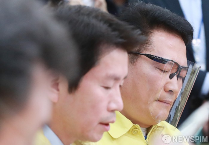 [서울=뉴스핌] 이형석 기자 = 송영길 더불어민주당 공동선대위원장이 20일 오전 서울 여의도 국회에서 열린 코로나19국난극복위원회·선거대책위원회 연석회의에서 코로나19 예방을 위한 안면 보호막을 쓰고 있다. 2020.03.20 leehs@newspim.com