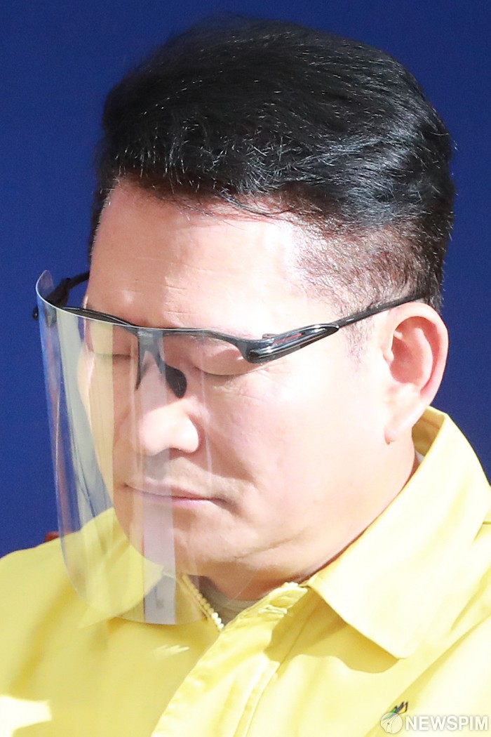 [서울=뉴스핌] 이형석 기자 = 송영길 더불어민주당 공동선대위원장이 20일 오전 서울 여의도 국회에서 열린 코로나19국난극복위원회·선거대책위원회 연석회의에서 코로나19 예방을 위한 안면 보호막을 쓰고 있다. 2020.03.20 leehs@newspim.com
