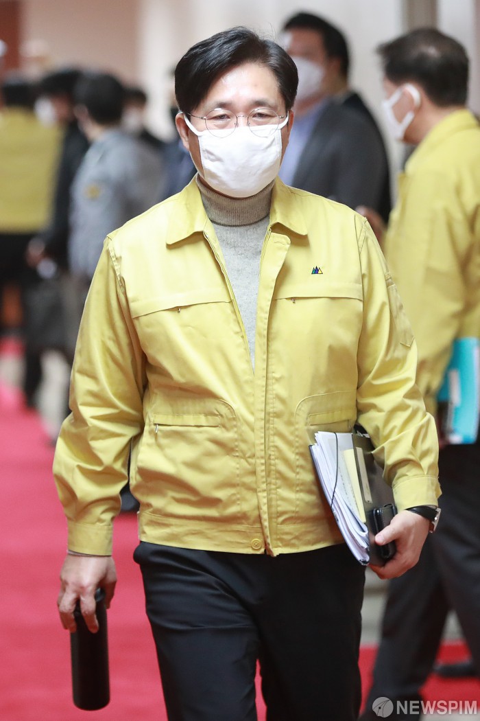 [서울=뉴스핌] 이형석 기자 = 성윤모 산업통상자원부 장관이 21일 오전 서울 종로구 정부서울청사에서 열린 비상국무위원 워크샵에 참석 하고 있다. 2020.03.21 leehs@newspim.com