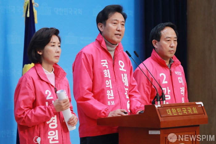 [서울=뉴스핌] 이형석 기자 = 4·15 총선 서울 광진을에 출마한 미래통합당 오세훈 후보가 24일 오후 서울 여의도 국회 소통관에서 서울시당 선거 공약 발표 기자회견을 하고 있다. 2020.03.24 leehs@newspim.com