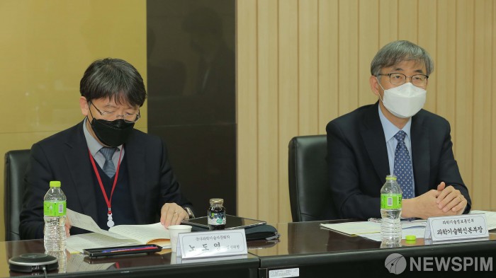 [서울=뉴스핌] 윤창빈 기자 = 노도영 국가과학기술자문회의 심의위원, 김성수 과학기술정보통신부 과학기술혁신본부장이 24일 오후 서울 종로구 국가과학기술자문회의 소회의실에서 열린 국가과학기술자문회의 제9회 심의회의에서 염한웅 부의장의 모두발언을 경청하고 있다. 2020.03.24 pangbin@newspim.com