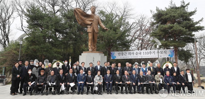 [서울=뉴스핌] 정일구 기자 = 26일 오전 서울 중구 남산 안중근 의사 동상 앞에서 열린 안중근 의사 순국 제110주기 추모식에서 김황식 안중근의사숭모회 이사장, 유영렬 안중근의사기념관장 등 참석자들이 기념촬영을 하고 있다. 2020.03.26 mironj19@newspim.com