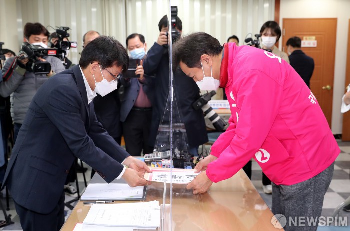 [서울=뉴스핌] 최상수 기자 = 21대 총선에 출사표를 던진 오세훈 미래통합당 광진을 후보가 26일 오전 서울 광진구 선거관리위원회에서 후보자 등록을 하고 있다. 2020.03.26 kilroy023@newspim.com
