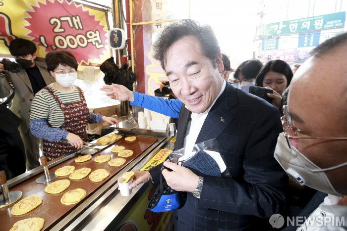 [수원=뉴스핌] 이형석 기자 = 이낙연 더불어민주당 상임 선대위원장이 1일 오전 경기도 수원시 팔달구 못골종합시장에서 상인들과 인사를 나누고 있다. 2020.04.01 leehs@newspim.com